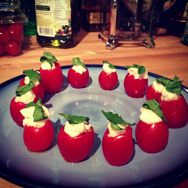 Caprese Cherry Tomatoes Published July 31, 2013 at 612 × 612 Cherry tomatoes stuffed with olive oil, mozzarella cheese, and topped with basil.